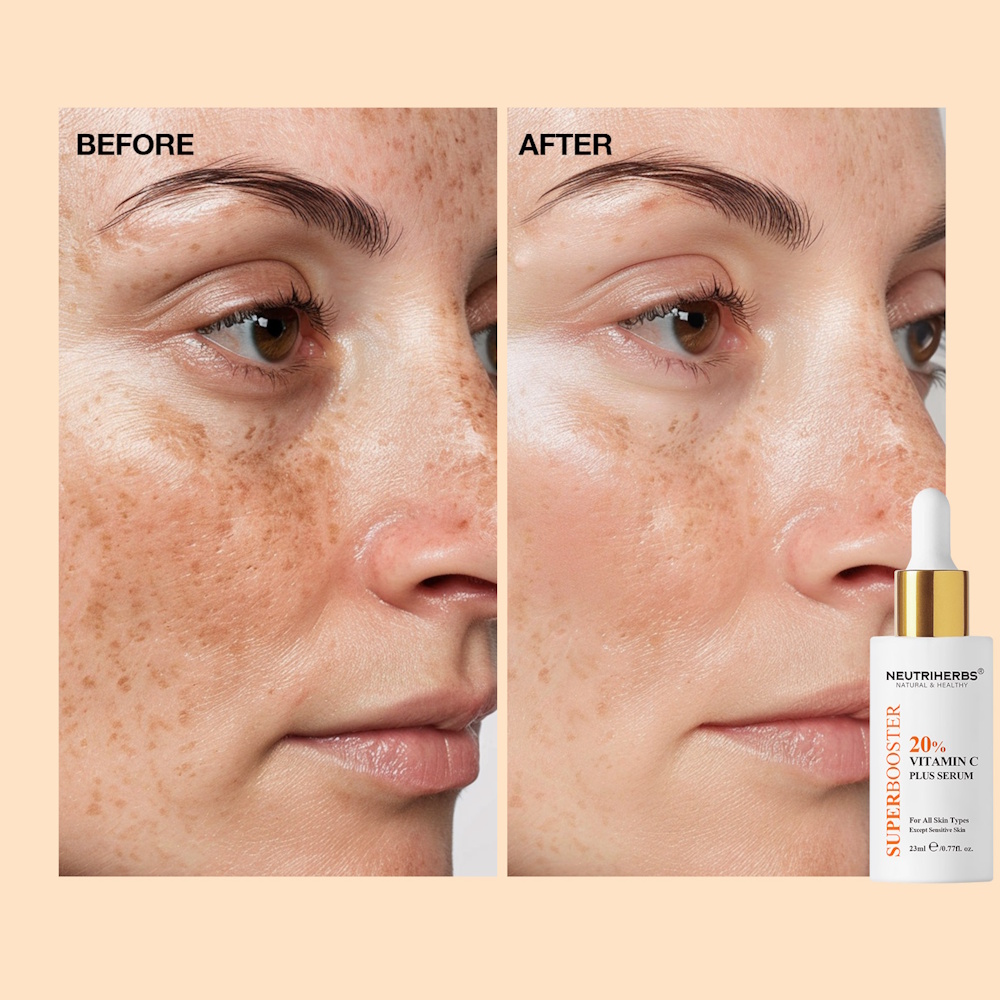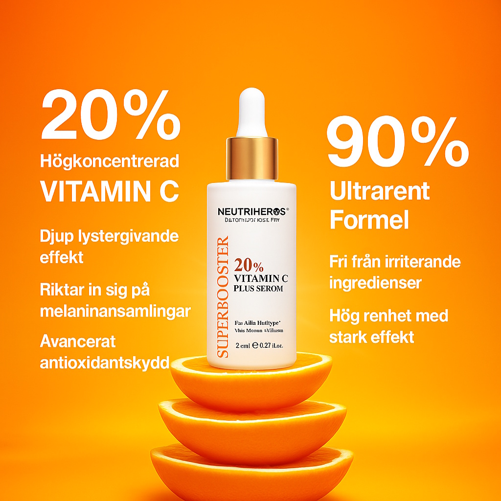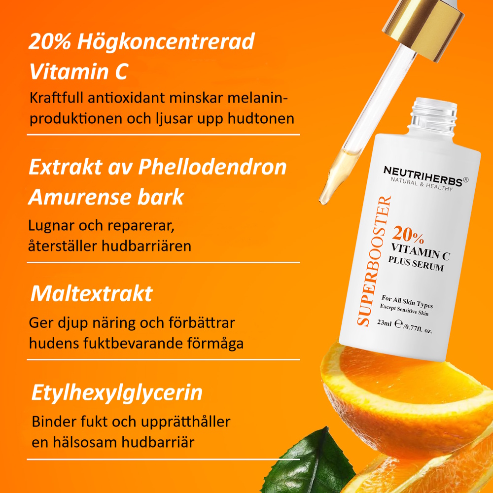 Detta kraftfulla super booster serum innehåller 20% stabiliserad C-vitamin, som aktivt arbetar för att ge huden lyster, jämna ut hudtonen och minska mörka fläckar. Med en lättabsorberad och effektiv formula är detta serum den perfekta dagliga behandlingen för dig som vill ha en klarare, slätare och mer strålande hud.
